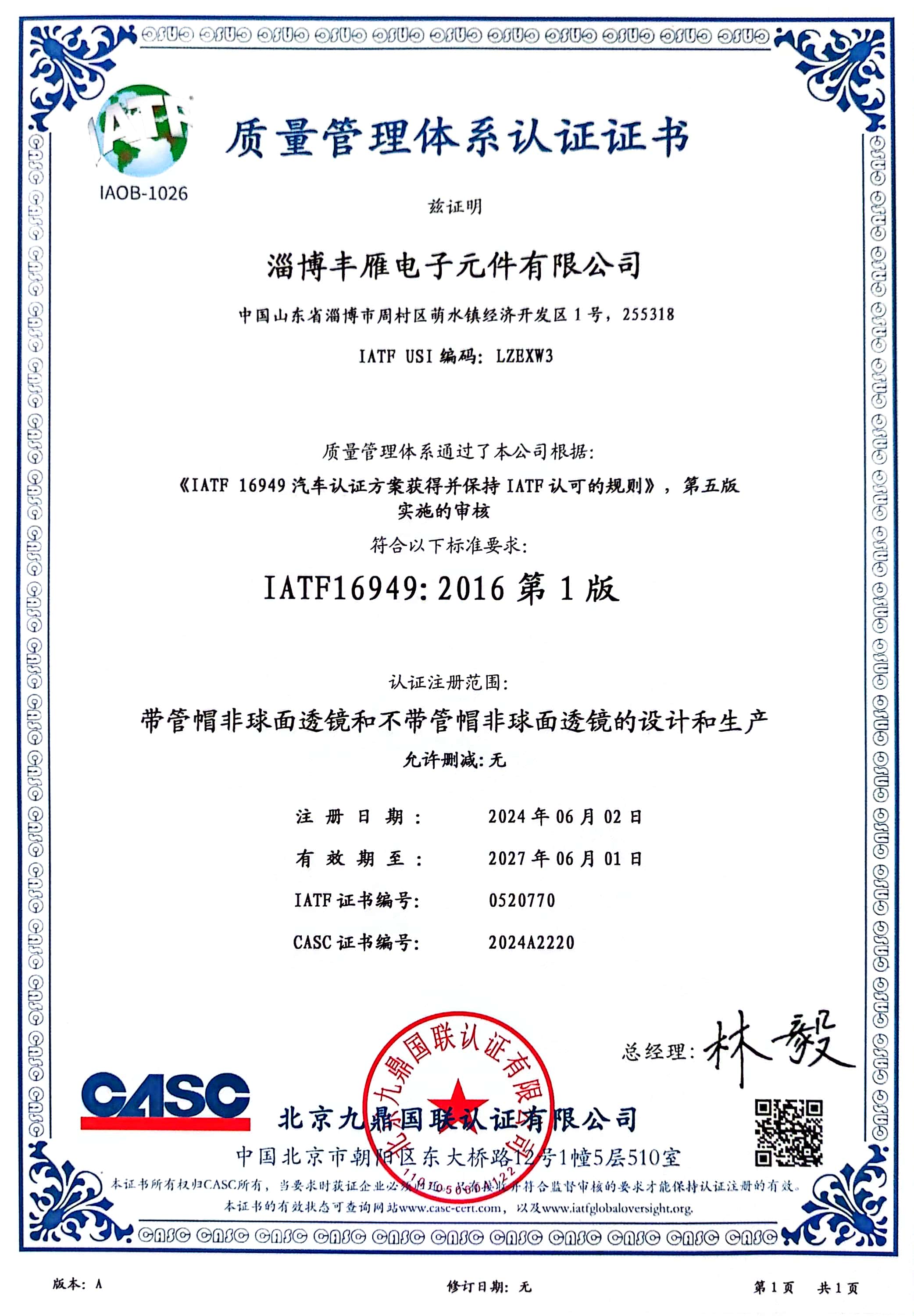 淄博豐雁電子元件有限公司,是一家集研發(fā)、生產(chǎn)、銷(xiāo)售為一體的透鏡管帽、晶體諧振器、晶體濾波器的高新技術(shù)企業(yè)。成立于1992年,坐落于山東省淄博市周村區(qū),注冊(cè)資金1000萬(wàn)元,擁有職工150余人,公司占地35000平方米,其中擁有5000平方的超凈化廠(chǎng)房,并配備了千級(jí)凈化工作臺(tái),確保環(huán)境的凈化度。公司下設(shè)光電事業(yè)部,濾波器事業(yè)部,晶體事業(yè)部等多個(gè)事業(yè)部。專(zhuān)注為光通訊、激光器領(lǐng)域以及各種電子應(yīng)用領(lǐng)域進(jìn)行電子元件配套。公司于1999年通過(guò)了ISO9000質(zhì)量體系認(rèn)證,公司提供的所有產(chǎn)品符合歐盟的R0HS和REACH標(biāo)準(zhǔn)。公司被認(rèn)定為淄博市“專(zhuān)精特新”企業(yè)、“淄博市企業(yè)技術(shù)中心”、省級(jí)“專(zhuān)精特新”企業(yè)、“山東省制造業(yè)單項(xiàng)冠軍”。公司擁有持續(xù)創(chuàng)新的研發(fā)團(tuán)隊(duì),有常年的外聘技術(shù)專(zhuān)家長(zhǎng)期指導(dǎo),并且與國(guó)內(nèi)多所大學(xué)和光電研究所保持長(zhǎng)期合作關(guān)系,確保了產(chǎn)品和技術(shù)的先進(jìn)性,能持續(xù)為客戶(hù)提供高質(zhì)量的產(chǎn)品和更好的全方位服務(wù)。